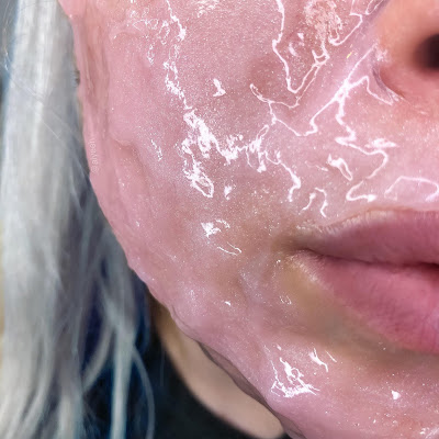 Once applied, the gel like substance had a chilling reaction on my face. I slathered it on thick, and the goop initially started to slide down. However, it did eventually set up without dripping off my face entirely. The slimy, rubbery texture and pink sparkly colour combine for a really fun experience compared to generic masks. It also has a strong, but pleasant aroma that reminds me of flowery, fruity Kool-Aid packet.